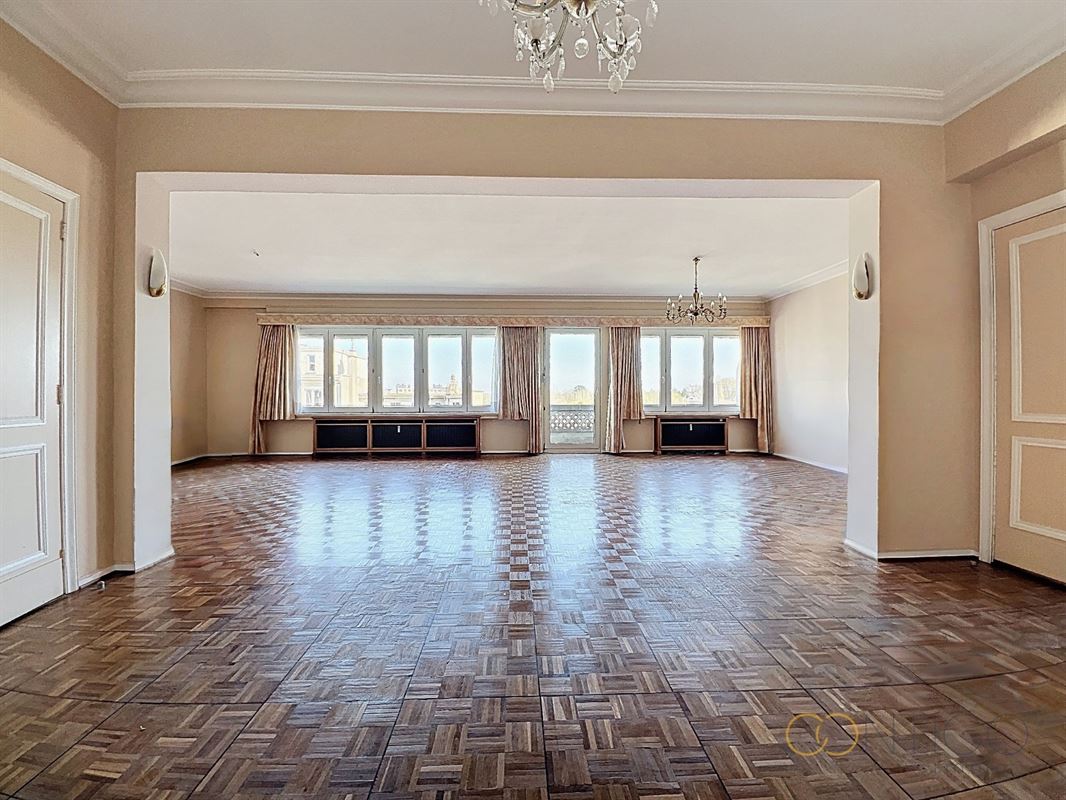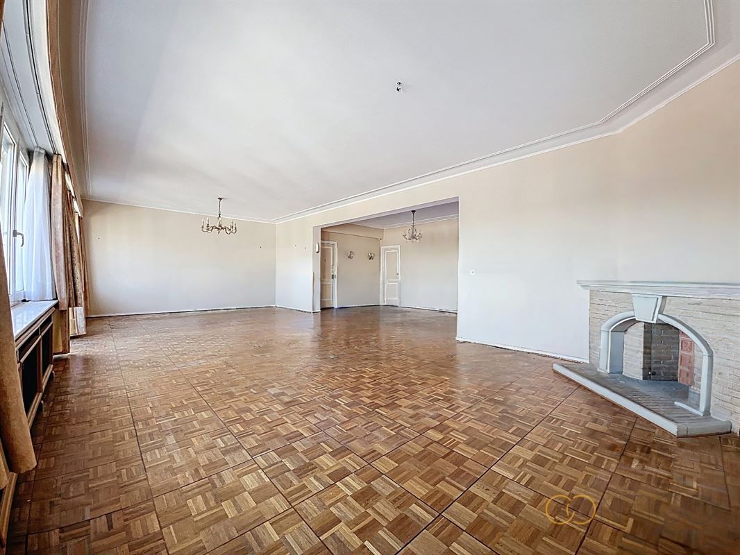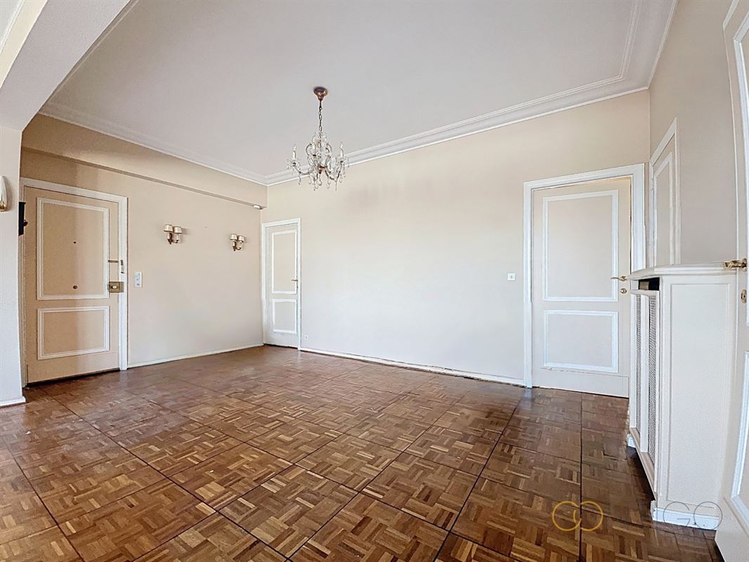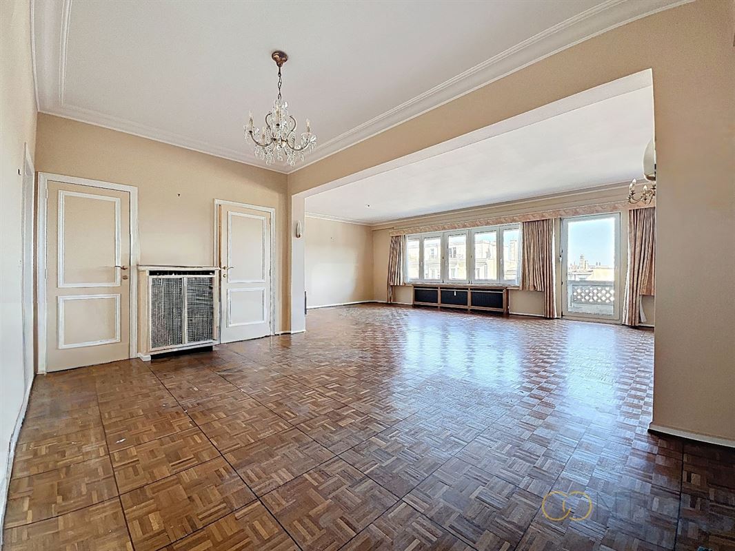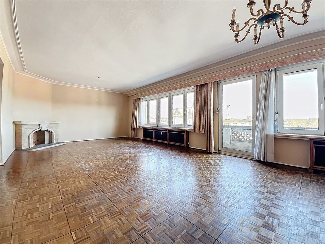 Situé au 6ième étage d’un immeuble de caractère, l’appartement s’ouvre sur un vaste hall d’entrée (18m²) menant à un lumineux séjour et salle à manger (52m²), avec accès à une agréable terrasse orientée à l’est (+-10m²). La cuisine séparée (12m²), fonctionnelle et bien agencée, dispose également d’un accès direct à une seconde terrasse orientée à l’ouest (+-6m²) et est complétée par une buanderie (6m²). L’espace nuit se compose de deux chambres confortables (14m² et 15m²), dont l’une avec accès à la terrasse et l’autre avec placards intégrés. Le hall de nuit (5m²) dessert également un dressing (3m²) ainsi qu’une salle de douche (5m²), rénovée vers 2015. L’appartement offre de nombreux espaces de rangement et dispose de deux WC séparés. Deux caves viennent compléter ce bien, ainsi qu’un box de garage proposé au prix de 45.000€.
